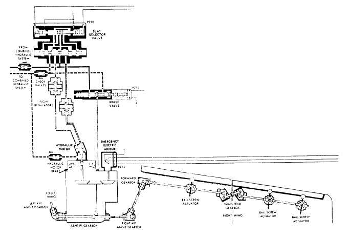 and retraction. OFFSET GEARBOXES. The eight offset gearboxes in the flap system transmit power produced by the flap drive gearbox around wing structure obstacles and compensate for wing angularity. They also reduce the flap drive gearbox speed of 1,080 rpm to about 550 rpm at the outboard actuators. FLAP WING-FOLD SHAFT. A wing-fold shaft consists of two interlocking splined sections and two universal joints connected to quill shafts. It provides a telescoping fold joint in the flap drive system linkage between the inboard and outboard wing panels.Slat System The slat system, shown in figure 9-37, provides additional lift and stability to the aircraft at lower speeds in the same manner as the leading edge flap