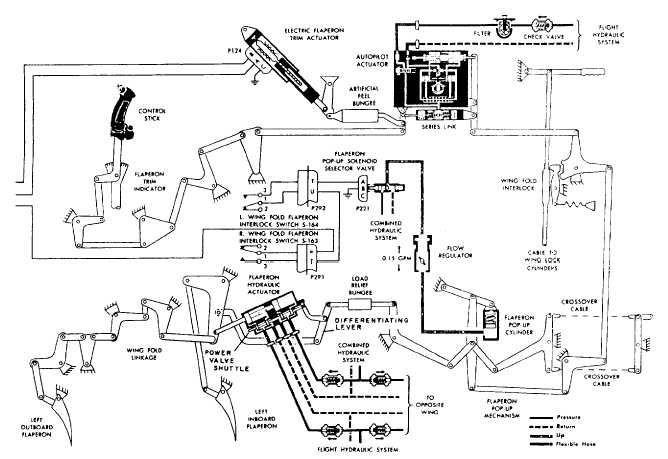 from the automatic flight control system cause the electrohydraulic servo valve to differ the pressures in the end chambers. The signal provides the working force for the actuator. The actuator piston rod drives the output lever. Pressure at the series link compresses a lock spring, unlocking the series link. The actuator can stroke the pilot-commanded piston. When the pilot moves the input link, relative motion between input and output causes the transducer to send a signal to the AFCS amplifier. The signal combines with other flight stability signals, and the resultant signal operates the servo valve. The AFCS can be overridden by the pilot applying a stick force of 25 pounds. SYSTEM ACTUATORS The flaperon system actuators directly control the flalperon movement in response to mechanical movement from the autopilot actuator. The actuator (fig. 9-1 2) consists of two tandem-mounted power pistons and a power valve shuttle. Mechanical inputs are introduced through the load-relief (safety) bungee and the valve input lever to the power valve shuttle portion of the actuator. The inputs cause a valve error and the porting of hydraulic pressure to the power pistons. As the flaperon moves, mechanical linkage attached to the actuator tends to null this valve error, The power valve shuttle returns to neutral. The flaperons remain in the selected position until new mechanical inputs are received from the pilot or the AFCS.
