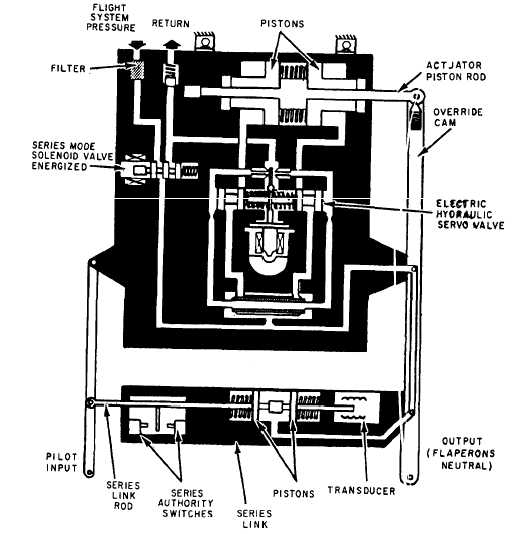 or series. In manual mode, the solenoid valve is de-energized and no fluid is ported to any part of the actuator. The actuator piston rod is free to idle. The series-link cylinder acts as a rigid link that transfers input lever motion to the output lever.In series mode, the solenoid valve energizes and ports pressure to the servo valve. Pressure from the servo valve drives the actuator pistons together. This pressure causes the pistons and the rod to act as one piece. When the servo valve is at null, pressures in the piston end chambers are equal. Electrical signals