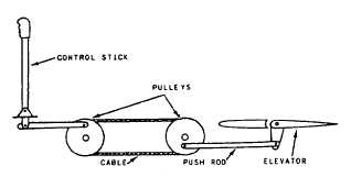 The aft sector is essentially the same as the forward sector, and it acts as a slave to the forward sector. Cables from the forward sector attach to the aft edges of the aft sector. A push-pull tube from the aft sector conncts to the elevator fitting assembly. The elevator fitting assembly, commonly called the elevator "horn," is built onto the elevators and extends outward (and usually downward) from the elevator surface at right angles to the plane of rotation and the chord line of the elevator surfaces. As the fitting assembly is moved fore or aft, the elevators are moved up or down. |