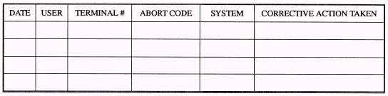 HELP-DESK SUPPORT The help-desk procedures we talk about here are those relating primarily to online users. To help your operators communicate effectively with online users, you will want to have procedures established for them to follow. To develop help-desk procedures, keep several steps in mind. These steps include logging the problem, researching the problem, fixing the problem, and analyzing the problem for possible changes to training and/or documentation. Once the problem has been fixed, the operator will notify the user that processing may be continued. You will want to monitor the help-desk support for its effectiveness and to provide feedback to, and receive feedback from, the users, subsystem coordinators, and managers as well as your own staff. Logging the Problem The operator logs a problem to document its occurrence and to provide the information needed to solve the problem. The information includes the abort code, what step in processing the user was doing, what system the user was on, and what corrective action was taken. Figure 1-7 is an example of a log sheet that can be used for making entries. This log provides a tracking system for user problems and can be used to show if a pattern is developing. If a pattern develops, this log will provide the necessary background information needed when the programmer is notified.
