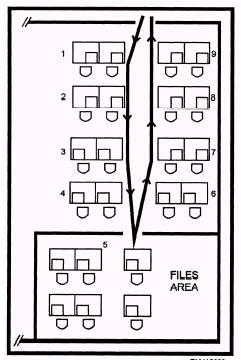 A communications facility should function effectively and efficiently. This is normally the result of the senior supervisor's ability to set up and manage the organization. Good supervisors retain open minds. They recognize the need for change and implement those changes as required. They acquire a thorough knowledge of the functions performed by their area of responsibility and understand how it relates to the overall mission. Only then can they plan a rational approach to correct a problem or make positive changes. Although the current structure and methods may meet the objectives of the division, a periodic review should still be conducted. The goal is to develop more efficient office methods, techniques, and routines. Procurement of state-of-the-art equipment may require a complete evaluation and reorganization of divisional workflow and workspace layout. To plan properly, the supervisor must know the following information: WHAT work is to be done; WHY the work is to be performed; l WHEN the work is to be performed; l HOW the work is to be accomplished; l WHERE the work is to be performed; and l WHO is responsible for completing the work. Good managerial traits and supervisory abilities are prerequisites for the first class or chief petty officer who is required to function as a front line supervisor and manager. The RM1 or RMC will normally be the RM supervisor and will have many managerial and supervisory responsibilities added to those present at the junior petty officer level. Supervision involves working with people, and a major responsibility of a supervisor is production. A good supervisor knows how to get a job done by getting the most out of personnel. However, the desire to attain an acceptable production level must not be at the expense of personnel assets. People have the right to be treated as individuals and respected as such. If treated in any other reamer, no amount of pressure will create a permanent increase in production levels. While you want to achieve a high level of production, you also want your personnel to produce willingly and be interested in their work. OFFICE MANAGEMENT The physical location of a communications office is normally predetermined by higher authority. Furthermore, the space allotted to the various sections is usually determined by competent engineers based on available space. After discussing the matter with the senior petty officers in the division, the division officer or division chief usually determines the physical location of furniture and equipment. When the office layout is being planned, primary consideration must be given to proper flow of paper and work, the physical location of workspaces, and the internal communications of the division. Secondary factors to be considered are the number of personnel to be accommodated, safety standards, security of classified material, structural location of electrical outlets, and physical locations of bulkheads and passageways. Paper and Work Flow Good paper flow is the smooth movement of paperwork from one desk or individual to another. As much as possible, the paperwork should flow in one direction through various sections with no reversals or criss-crossing. Figure 2-2 shows the ideal communications space layout with sequential workflow. Placing related tasks in adjacent spaces reduces distance and increases efficiency of operations. This ultimately increases the work accomplished. Workflow affects the placement of sections within the division and the location of desks, files, and other equipment. Changes should only be made to improve workflow. Deviations from approved methods can result in loss of time and motion and cause delays in completion of work assignments. The physical layout of workspaces should be reviewed when: There is evidence of improper workflow; The number of personnel or office procedures change; The volume of work increases or decreases;