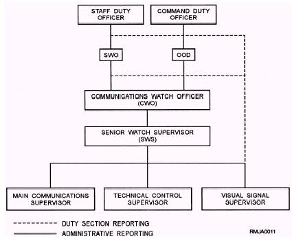 Figure 2-4.-Communications watch organization. Operation orders are prepared in accordance with a standing format, as set forth in Naval Operational Planning, NWP 11 (NWP 5-01). An OPORD is an operations plan made up of the heading, body, and ending. The basic plan, contained in the body of the OPORD, is concise and contains minimum detail. More detailed information on various ship departments is contained in enclosures (called annexes and appendixes). The annex of most concern to radiomen is the communications annex. The communications annex, along with its appendixes and tabs, discusses the many details to be considered in planning communications for a particular operation. In this annex, you can find such information as the applicable circuits, equipment, and frequencies that will be used in the upcoming operation. STANDARD OPERATING PROCEDURES In addition to the OPORDs, you should also become familiar with the standard operating procedures (SOPs) used by your division and department. SOPs should be sufficiently complete and detailed to advise personnel of routine practices. The detail depends upon such variables as the state of training, the complexity of the instructions, and the size of the command. Staff sections, divisions, and departments often find it convenient to establish their own SOPs for operating their respective areas and for guiding their personnel in routine matters. Some examples of communications SOPs are: Procedures for persons going aloft; Handling of visitors in radio spaces; and MINIMIZE procedures. Communications SOPs are written to meet an objective. SOPs may vary from command to command and may differ according to their objectives. Your job will be to recommend changes or maybe even write the objectives. In any event, a complete set of SOPs will enable you and your shipmates to perform your duties in a responsible, professional, and safe manner. MESSAGE LOGS Accounting for messages addressed to your guard list (list of commands for which you receive message traffic) is the most important part of processing messages. Accounting for all messages processed in your message center is accomplished with logs. Although ashore and afloat automated systems automatically log, store, and retrieve messages, there still is a need to manually log and file both incoming and outgoing messages. CENTRAL MESSAGE LOG Depending upon the traffic volume processed, a message center may use either a separate outgoing/incoming log or a combined Central Message Log to record processed message traffic. All messages are logged in the Central Message Log after they have been logged in the appropriate circuit log. The normal practice is to use separate logs for outgoing and incoming messages (figure 2-5). The entries in the Central Message Log are station serial number (SSN), precedence, DTG (original on a readdressal), originator (original on a readdressal), subject, classification, time of receipt (TOR) for incoming messages or time of delivery (TOD) for outgoing messages for each message. It is also useful to indicate on the log over which circuit the message was relayed. This is helpful during tracer situations. The Central Message Log is filed in the communications center master file on top of the messages processed for that radio day (raday). |