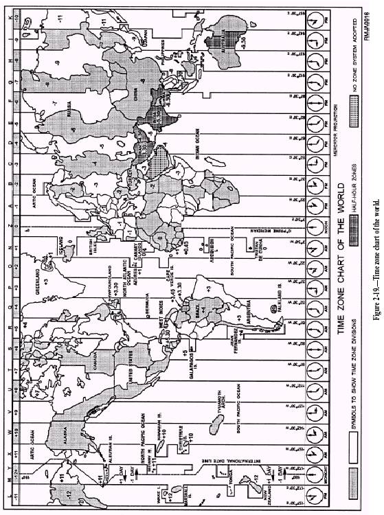 Figure 2-19.-Time zone chart of the world. AUTODIN system. This ECP is identified by the precedence prosign Y and is limited to designated emergency action command and control messages. |
