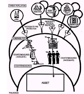 Figure 4-5.-Threats, vulnerabilities, and countermeasures. Not all attacks and events can be avoided. If we cannot reasonably prevent something, we want to detect the problem as early as possible, minimize the damage and destruction, and recover as quickly and efficiently as possible. To help us minimize and recover, we develop contingency plans. Contingency plans (backup plans) provide for the continuation of an activity's mission during abnormal operating conditions. These are plans for emergency response, backup operations, and post-disaster recovery. They include a preparation phase that includes the steps to be taken in anticipation of a loss to