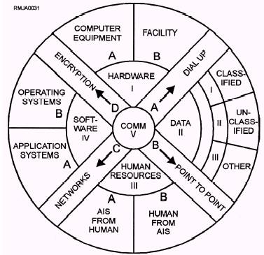 SCOPE OF AIS SECURITY As the Navy has become increasingly dependent on the use of AIS for its payroll, supply functions, tactical information, and communications, the need to protect AIS assets has taken on greater importance. Risk management is an ongoing effort. Whether you are in a large AIS facility with a full-time information system security manager (ISSM) or a facility where the functions of the ISSM are a collateral duty, your installation will have established security measures to protect its AIS assets. The five areas of consideration for the Navy's AIS security program are hardware (I), data (II), human resources (III), software (IV), and communications (COMM) (V). These are shown in figure 4-7. Because each AIS facility is different, each facility has its own AIS security risk management program. You'll be responsible for following the requirements of your facility's AIS security program. In the next paragraphs, you will learn about management responsibilities, your responsibilities, physical security measures, and data security measures. Again, our goal in AIS security is to prevent or minimize the opportunity for modification, destruction, disclosure, or denial of service. MANAGEMENT RESPONSIBILITY AIS security is everyone's responsibility, and only the commanding officer (CO) can ensure that AIS security receives the support required at every level. The success of your command's AIS security program depends upon the support of the CO. The CO and the AIS security staff are responsible for taking the necessary steps to provide an adequate level of security for all AIS-related activities, automated information systems, and networks, including those developed, operated, maintained, or provided by contractors. Each AIS facility has an information system security manager (ISSM). His or her primary duty is to serve as the single point of contact for all matters relating to AIS security at your command. The ISSM usually reports directly to the CO. Now, let's talk a little about the security staff.