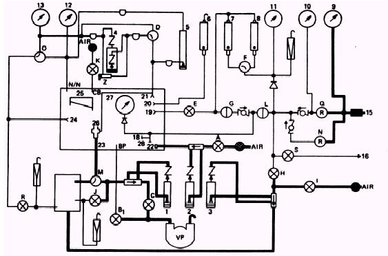 ALTITUDE SENSING SYSTEM This system (figure 2-9) senses the pressure (less 1 atmosphere) in the altitude chamber or suit simulator tank. In this case, we refer to atmosphere as a unit of pressure equal to 14.69 pounds per square inch. Both the high-range and lowrange altimeters are operated by differential pressure. The high-range altimeter (12) senses the altitude inside the chamber through the chamber reference port (N/N). When you place the pressure selector valve (O) in the ALTITUDE CHAMBER position, the low-range altimeter senses the altitude through the same chamber reference port (N/N). The low-range altimeter also senses the pressure inside the suit simulator tank. You must place the reference pressure selector valve (O) in the SUIT SIMULATOR position and open the suit simulator reference shutoff valve (R) for the low-range altimeter to read this pressure. PRESSURIZING THE ALTITUDE SENSING SYSTEM When you pressurize the altitude sensing system, be sure the reference pressure selector valve (O) is in the ALTITUDE CHAMBER position and open the vacuum control valve (Bl). When you open the control valve (Bl), ascend to 50,000 feet. The altitude will be indicated on the high-range altimeter (12). Stabilize with control valve B1 at this altitude and check for leaks. Open chamber bleed valve (K) and return to sea level. Close valve (K) when you reach sea level. If you find that the test stand has no leaks at this point, turn the reference pressure selector valve (O) to the SUIT SIMULATOR position; then open the suit simulator reference shutoff valve (R) fully. Place the flow selector valve (M) in the SUIT SIMULA-TOR position. Now you are ready to ascend to altitude. Open the vacuum control valve (Bl) and ascend to 35,000 feet. This altitude will be indicated on the low-range altimeter (13). Again stabilize with control valve (B1) and check for leaks. Close the vacuum control valve (B l) and return to sea level. To setup the test stand for the chamber bleed system test, close the chamber bleed valve (K). Place the reference pressure selector valve (O) in the ALTITUDE CHAMBER position; close the suit simulator shutoff valve (R) and place the flow selector valve (M) in the REGULATOR position. Leave all valves and connections in their present position. CHAMBER BLEED SYSTEM The chamber bleed system shown in figure 2-10 is a very simple system used to introduce a large volume of air into the altitude chamber. When you open the chamber bleed valve (K), ambient air flows into the chamber through the chamber bleed port (CB). The altitude in the chamber drops until the pressure inside the chamber equalizes with the pressure at sea level. PRESSURIZING THE CHAMBER BLEED SYSTEM Open the vacuum control valve (B1) and ascend to 10,000 feet; then close the valve to stabilize your altitude. A drop in altitude on the low-range altimeter (13) indicates a leak. If there is no drop in altitude, open the chamber bleed valve (K) and descend to sea level. When you reach sea level, close the chamber bleed valve (K). The test stand is now ready to test the flow measuring system. FLOW MEASURING SYSTEM This system is the largest and most important system on the test stand. The purpose of the flow measuring system is to measure flows of air, nitrogen, or air/nitrogen mixture from an item under test. As you can see in figure 2-11, the system consists of vol-o-flow elements, flow indicating manometers, control valves, and selector valves. The flow measuring system is made up of the output, input, and vent flow subsystems. The different subsystems function with the vacuum running. Output The output flow system originates at the piezometer (26) and flows through the output port (23) to the flow selector valve (M). It is then directed to either the output vol-o-flow element or the suit simulator tank. When the flow selector valve (M) is placed in the REGULATOR position, the flow is directed to the output vol-o-flow element. The volume of flow is controlled by the output valve (C) and is indicated on the output flow manometer (l). The only time this system is used with the flow selector valve (M) in the SUIT SIMULATOR position is when the full pressure suit breathing regulator is tested.