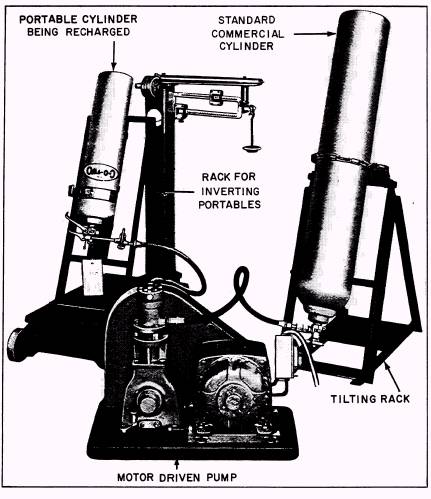 Figure 3-1.\C-O-TWO Transfer Unit. starter arrangements. This model was previously manufacturered by two companies, the C-O-Two Fire Equipment and the Norris Fire and Safety Equipment. The SC-5 motor is mounted on a sliding, adjustable base so that its position maybe altered to take up any slack that may develop in the drive belt. The SC-5 pump is a single-cylinder design with a working pressure of approximately 3500 pounds per square inch. This unit has the capability of transferring approximately 80 percent or 38 pounds of carbon dioxide from a fully charged 50-pound supply cylinder. . The pump head is fitted with a flangible safety disc. This safety disc is designed to relieve pressure in the pump at 2650 to 3000 pounds per square inch. The safety disc nut prevents any recoil in the event the safety disc ruptures. As you can see in figure 3-2, the safety disc washer is arranged so you can easily replace it. The lubricating system is an automatic controlled splash type. The oil flow is regulated by a fixed orifice in the oil trough. This action cannot be seen in figure 3-2. A good grade of SAE viscosity #30 automotive oil should be used when you change or add oil. The drive from the motor to the pump is a combination of V-belt drive pulleys and gears. The small gear and large pulley are assembled together as a unit and are both fitted with ball bearings and mounted on the idler shaft. Both pulleys are carefully balanced. A single guard is secured over both gears and pulleys. The motor, furnished as standard equipment, is a 1-horsepower capacitor start induction type. It is suitable for operation on either a 110- or 220-volt, single-phase, 60-hertz circuit. (A dc motor is also available.) An enclosed control switch is located on the side of the motor. INSTALLING AND SERVICING NEW EQUIPMENT After receiving the equipment, you should examine the components for damage. If the unit is damaged, do not attempt to repair it. Return it to the supply officer for reshipment to the manufacturer. Since the oil was drained from the crankcase of the pump before it was shipped to the field activities, be sure to fill it with a standard grade of SAE #30 lubricating oil before you start the unit. On pumps equipped with an oil filler plug and measuring stick, fill them only to the upper groove on the stick. On a unit equipped with an oil cup and no measuring stick, fill it to within one-fourth inch of the top of the cup. Other than the crankcase, only one point on the pump requires lubrication. This point is on the shaft of the idler gear and pulley and is equipped with an Alemite lubrication fitting. In spite of the fact that the pulley shaft was lubricated at the factory, it is advisable to relubricate the area with two or three applications (grease gun shots) of light cup grease before you start the unit. The motor bearings contain enough grease to last for approximately 2 years under average conditions. Before running the pump, you must find an electric circuit compatible to the motor or install one in the shop. Unless otherwise specified, motors are wired to operate on 110-volt, 60-hertz, single-phase circuits. When 220-volt, 60-hertz, single-phase current is available, the hookup of the motor should be rearranged so that it can run on this circuit. A 220-volt wiring diagram is shown on the nameplate of the motor. The plug on the end of the lead conducting the current to the motor from the power outlet should be equipped with a grounding wire, or third wire, which is usually insulated by a white covering. Regardless of whether a three-pronged plug or a pigtail (coming out of the lead near a two-prong plug, fitted with a clip) is used, the system to which you attach this grounding wire must also be grounded to protect the unit. WARNING Before you attempt any work on the electrical circuit, be sure the power source is disconnected. Always "run-in" a new pump or one that has been idle for a long time. This action, accomplished with the CO2 hoses disconnected, is performed as a check for lubrication to make certain that all parts are thoroughly treated. After you turn off the pump, wipe off all excess lubricants. Before you pump carbon dioxide, examine all line connections on both the inlet and outlet hoses. Make certain that all connections between the components are tight. This is important since carbon dioxide is stored under approximately 850 psi at an atmospheric temperature of 70F. Use a slow, steady pull to tighten connections with a wrench no larger than 12 inches in length. Page 3-3.