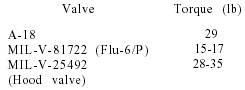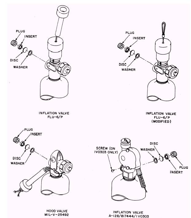 Figure 3-9.\Disassembly of Inflation Valve Safety Disc Assembly. by the introduction of nitrogen at 200 psi and then the addition of a proper charge of carbon dioxide. The addition of nitrogen in carbon dioxide cylinders provides additional pressure. This pressure expels the carbon dioxide at extremely cold temperatures (below 0F) at a much higher rate than would the pressure of the carbon dioxide itself. Winterized cylinders have a carbon dioxide charge less than rated capacity. As a result the total pressure is lower at high temperatures than with rated charge, even though nitrogen has been added. Thus winterized cylinders can be subjected to 160F without the safety disc rupturing. REPLACING SAFETY DISCS AND WASHERS ON INFLATION VALVES If you are not familiar with the flotation equipment, replacing safety discs and washers on the various CO2 cylinders can be very difficult. You will need some special tools to replace the . safety disc and washers on inflation valve assemblies A-128/817444, MIL-V-81722 (Flu-6/P), and MIL-V-25492 (figure 3-9). You will require a torque wrench, a five-sixteenth inch socket, and apiece of hex stock 5/16 x 2 inches long. Once you have these tools, changing the safety disc will be a simple process. WARNING Before you perform any work on inflation valves, ensure that CO2 inflation assemblies are completely discharged. Do not remove the valve or valve safety disc plug from a charged CO2 assembly. Insert the 5/16- x 2-inch stock into the disc plug and remove the safety disc plug. Then insert the safety disc and washer as shown in figure 3-9. To replace these items, simply reinstall them into the inflation valve. Remember to install new washers and safety discs. Use a torque wrench to make the following torque valve adjustments.