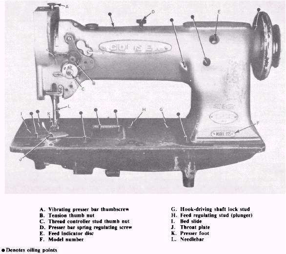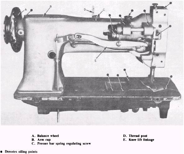 Figure 4-1.-Front view of Model 225 sewing machine showing oiling points.