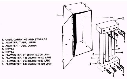 Figure 1-4.\Flowmeter Calibration Kit. 1-7 beginning with the 0-to-150-lpm flow element (FLM-4), proceed as follows: 1. Using hose assembly 3 (figure 1-5), connect the top connection of the 500-to-750-mm calibration kit flowmeter 9 (figure 4-4) to test stand flow element connection NIP-4. Using hose assembly 6 (figure 1-5), connect the bottom connection of the calibration kit flowmeter to bell jar base coupling C-1. 2. Set flowmeter selector valve V-1 to the 0-to-150-lpm position. Ensure system bleed valve V-5 is closed. NOTE: Flows used shall be taken from the mm column of the calibration correction cards. This previously completed column contains flows in millimeters (mm) equivalent to corresponding lpm flows. 3. Using oxygen supply valve V-6, set the flow equivalent to 150 lpm (from correction card number 4) on the 500-to-750-mm calibration kit flow element. The flow, in inches H 2O, will be displayed on flowmeter indicator PG-2. Enter this reading in the indicated in. H 2O column of correction card number 4 opposite the actual mm flow being drawn. 4. Reduce the flow to the next millimeter reading by adjusting oxygen supply valve V-6. Repeat step 3. Continue in this manner until all flows on correction card number 4 have been completed. 5. Close oxygen supply valve V-6 and disconnect the hose and the calibration kit flowmeter from the test stand. NOTE: Hose assembly 3 (figure 1-5) and hose assembly 6 are used in calibrating all linear flow elements. 6. Connect the top connection of the 250-to-500-mm calibration kit flowmeter to test stand flow element connection NIP-3; connect the bottom connection to bell jar base coupling C-1. Rotate flowmeter selector valve V-1 to the 0-to-50-lpm position. Ensure system bleed valve V-5 is closed. 7. Repeat procedures outlined in steps 3 through 5, using flows given on correction card number 5. 8. Connect the top connection of the 125-to-250-mm calibration kit flowmeter to test stand flow element connection NIP-2; connect the bottom connection to bell jar coupling C-1. Rotate flowmeter selector valve V-1 to the 0-to-1.0-lpm position. Ensure system bleed valve V-5 is closed. 9. Repeat procedures outlined in steps 3 through 5, using flows given on correction card number 6. 10. Connect the top connection of the 0-to-125-mm calibration kit flowmeter to test stand flow element connection NIP-1; connect the bottom connection to bell jar base coupling C-1. Rotate flowmeter selector valve V-1 to the 0.0-to-0.25-lpm position. Ensure system bleed valve V-5 is closed. 11. Repeat procedures outlined in steps 3 through 5, using flows given on correction card number 7. 12. Disconnect hoses 3 and 6 (figure 1-5) from the calibration kit and test stand. Close oxygen supply cylinder valve V-6 and open system bleed valve V-5 to bleed the test stand. Secure all test stand valves. TROUBLESHOOTING A properly working test stand will give you outstanding results while testing oxygen converters. As with any test stand, a small leak in your plumbing system will give you inaccurate readings and may cause you to think you have a defective converter or component. Some parts on the 59A120 test stand must be corrected when they become defective by the on-site meteorology calibration team. You might have a gage that has a pointer which isn't zeroed, or you might have a flow element that consistently reads low. You could also have a gage that provides correct readings over only part of the scale. In such cases, you will need the calibration team's assistance to repair the component. Upon completion of any maintenance action, you will be required to fill out a Ground Support Equipment Subcustody and Periodic Maintenance Record (OPNAV 4790/50) and a Ground Support Equipment Custody and Maintenance Record (OPNAV 4790/51). The following problems may occur within your test stand; you, as a senior PR, will be required to fix them. Refer to NAVAIR 17-15BC-20 for parts removal and replacement. |