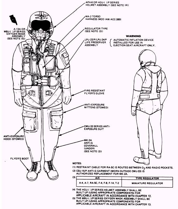 Figure 5-1.\Personal survival equipment. a number of ways to stay afloat. Figure 5-1 shows the personal equipment worn by the VA, VF, or VS aircrewman. The primary flotation device shown is the LPU life preserver; however, a closer look reveals that the aircrewman is also wearing an anti-g suit. This g suit is an excellent flotation device itself. When the aircrewman orally inflates the g suit, it provides additional emergency flotation. NOTE: In the event the g suit becomes the only flotation device, it should be removed from \-- \ the legs and worn as water wings. If left on the legs and inflated, it could cause the aviator to become inverted in the water (head down). Many different types of life preservers are used by naval aviation personnel. The Mk-1 is used by maintenance personnel working aboard ship. The LPU-30/P is used as a substitute for the LPP life preserver aboard carrier-onboarddelivery (COD) and vertical-onboard-delivery (VOD) aircraft. The LPP life preservers are worn by passengers flying in naval aircraft. The LPA-2B and the LPU-21B/P are worn by aircrewmen flying in nonelection-seat-equipped aircraft. The LPU-23A/P and the LPU-24A/P are worn by aircrewmen flying in ejection-seatequipped aircraft. These two life preservers are equipped with automatic inflation systems in addition to the manual actuation systems. The FLU-8A/P automatic inflation feature will be explained later in this chapter. Each of the life preservers we will discuss is equipped with CO2 cylinders that will inflate the preserver once it is actuated. Manual activation of the CO2 cylinders on life preservers requires only a simple pull on the beaded handle or toggle shown in figure 5-2. Life preservers inflate