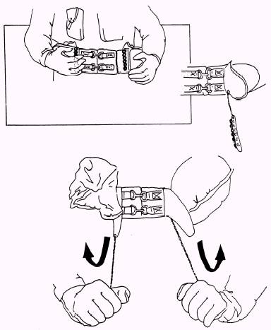 Figure 5-2.\LPA inflation. to their designed shape within 30 seconds; however, depending on ambient temperature, they may require additional air pressure. Air pressure can be added by unscrewing the locking device, pushing in on the valve, and blowing air into the preserver through the oral inflation tube. The LPU-23A/P or the LPU 24A/P life preserver assemblies have an automatic inflation device designated the FLU-8A/P. The FLU-8A/P automatic inflation assembly consists of a body assembly and a sensor housing. The body assembly contains a cartridge, piercing pin, spent-cartridge indicator, firing check port, packing loop, cam lever, lanyard assembly, and nylon release pin. The body assembly also provides for the attachment of a charged CO2 cylinder. The sensor housing contains an electronic circuit, two batteries, and a sensor plug assembly containing the battery contact spring and the sensor pin. The inflation devices are attached to each valve stem located on the waist lobes. In addition, a beaded handle with a manual inflation lanyard is connected to each inflation device. NOTE: The FLU-8A/P can be operated either manually or automatically, although the manual mode is considered the primary mode. MANUAL MODE.\ The attached lanyard assembly, when pulled, rotates the cam lever, releasing the packaging loop lanyard from the nylon release pin and forcing the piercing pin into the diaphragm of the CO2 cylinder. The CO2, under pressure, is forced through the body of the device to inflate the life preserver. |