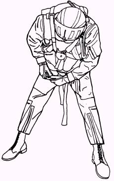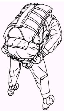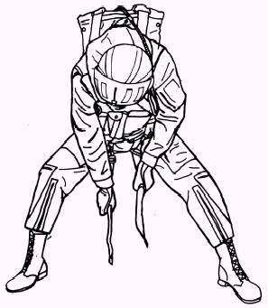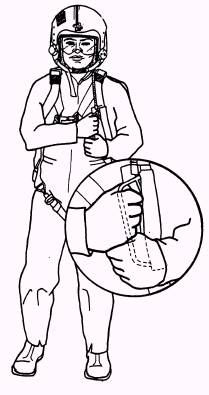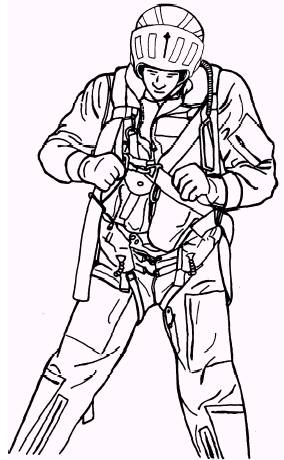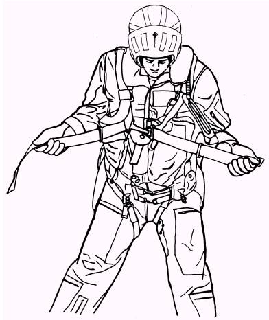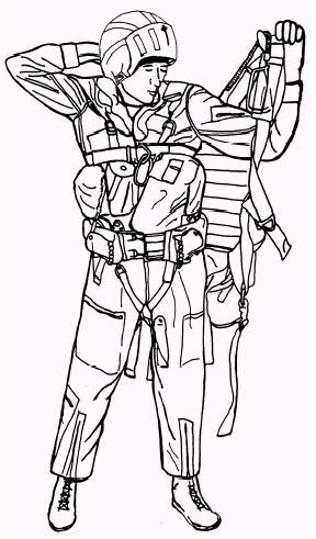 Figure 5-3.\Aircrewman grasping shoulder straps. buoyancy. An LPP life preserver that provides a buoyancy of 29 pounds is more than sufficient to keep a 200-pound man afloat for an indefinite length of time. OPERATIONAL DIFFICULTIES OF LIFE PRESERVERS.\ With all the equipment worn by aviators, life preservers must completely inflate to provide the buoyancy necessary to keep them afloat. Partial inflation of the collar lobe on the LPA and LPU life preservers is a reported problem. Improper functioning of the hook-and-pile tapes that hold the collar lobes in the packed condition causes this problem. If the hook-and-pile tapes fail to open, simply pull them apart and the preserver will fully inflate the collar lobe. BAILOUT PROCEDURES USING THE # FOUR-LINE RELEASE AND THE LPA LIFE PRESERVER.\ Each aircraft has its own bailout procedure. The Naval Air Training and Operating Procedures Standardization (NATOPS) manual outlines the emergency procedures for each aircraft. We will discuss the emergency egress procedures for the P-3 aircraft. When the command is given to bail out, the aircrewmen don their parachutes. We are using the NB-8 personal parachute to describe the bailout procedures. Grasp the shoulder straps as shown in figure 5-3 and place the parachute onto your back (fig. 5-4). Use the quick-release snap and the V-ring to attach the chest strap in place (fig. 5-5). When you are donning the parachute over the LPA/LPU life preserver, be sure the harness