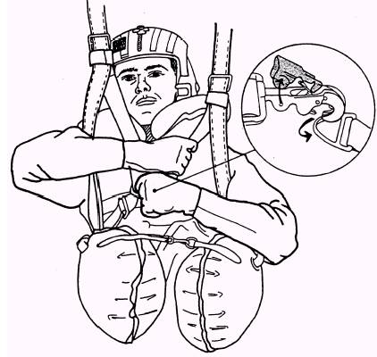 Figure 5-15.\Aircrewman grasping left main sling webbing with right hand. WARNING Carefully inspect the canopy and suspension lines prior to using the four-line release. If any parachute damage is evident or if there are broken suspension lines, do NOT use the four-line release system. The four-line release system should not be used at night since parachute damage may be difficult to determine. To operate the four-line release system, you locate the two lanyard pull loops. They are on the inside of the rear risers. Pull the lanyard pull loops sharply downward (fig 5-14). This takes approximately 20 pounds of pull force. This action frees the rear four suspension lines, which allows the canopy to form a lobe in the rear center and permits a steady escape of air, which reduces