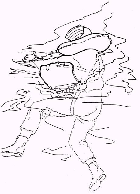 Figure 5-19.\Aircrewman turning 90 degrees. such as the C-9, C-12, and C-44. These aircraft carry life rafts that vary in capacity from 7 to 25 persons. Three basic designs of life rafts used in naval aircraft are shown in figures 5-20, 5-21, and 5-22. LR-1 LIFE RAFT ASSEMBLY.\ The LR-1 assembly (fig. 5-20) consists of a one-man life raft and an inflation assembly (CO 2 cylinder with inflation valve). The life raft has a single flotation tube with a noninflatable floor. It is 6 feet long when fully deployed. It is blue and features a weather shield, a sea anchor, a sea anchor pocket, and ballast bags with a retaining line and pocket. . The weather shield is sea blue on the outside and fluorescent red on the inside. It is sewn to coated cloth tape, which is cemented around the periphery of the life raft. When the securing straps (which are manufactured from hook-and-pile tape) are properly positioned, the hooks interweave with the pile to hold the weather shield in a stowed condition. . The sea anchor is attached to one end of the lanyard and is stowed in a pocket outboard of the flotation tube. The other end of the lanyard is attached to a ring located at the bow end of the raft. Inflation Procedures.\ There are two inflation systems for the LR-1 life raft. The CO 2, a mechanical system, inflates the raft within 30 seconds and is normally used during parachute descent. If the mechanical system fails, the oral inflation system is used to inflate the raft. The oral inflation system consists of a length of rubber tubing; an oral inflation valve with a rubber mouthpiece; and a knurled, locking collar. The oral inflation valve may be used in topping or relieving pressure from the flotation tube; this may become necessary because of temperature changes from daytime to nighttime. The raft should not be inflated drum tight, as it will ride more comfortably in choppy seas if the pressure is slackened. Righting Procedures.\ The LR-1 life raft is equipped with boarding handles to assist the survivor in boarding the life raft. You can easily right the LR-1 life raft by grasping the boarding handles on the flotation tube and turning it over.