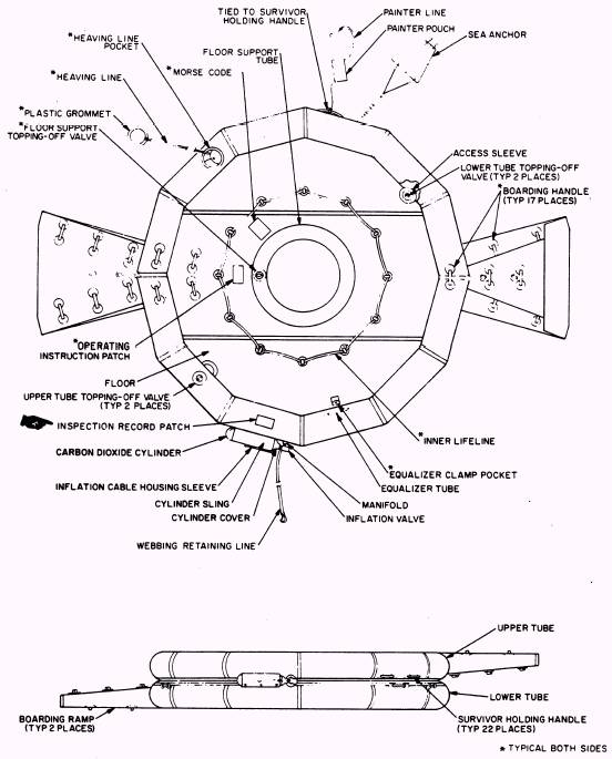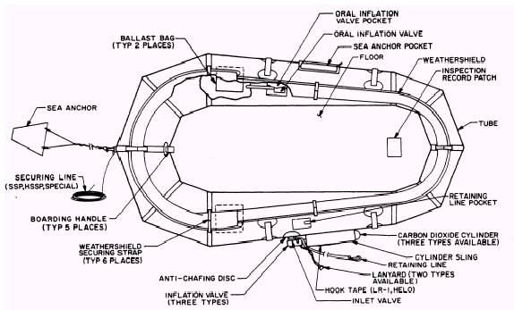 Figure 5-20.\LR-1 life raft assembly parts nomenclature. Boarding Procedures.\ The design of the LR-1 life raft makes it easy to board. Approach the life raft from the small end. One end is noticeably smaller than the other. Grasp the small end of the flotation tube with both hands. Locate the boarding handles and push the life raft down into the water. To board the raft, pull your body into the raft so that the upper body is completely inside. Once you are inside the raft, roll your body so that you are lying face up or in a sitting position. Now deploy the sea anchor. The sea anchor reduces drifting. Adjust the length of the sea anchor securing line so that the sea anchor rests in the wave trough and causes the life raft to ride on the crest of the wave. Always remain attached to the raft; if it capsizes in rough water or during high winds, it will be lost if not securely fastened to you. LRU-12/A LIFE RAFT ASSEMBLY.\ The LRU-12/A, 13/A, and 14/A are very similar in design. The basic difference is size. The LRU-12/A carries 4 survivors, the LRU-13/A carries 7, and the LRU-14/A carries 12. Of the three, only the LRU-12/A life raft is discussed in this chapter.
