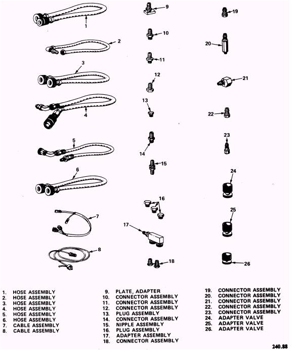 Figure 1-5.\Test Stand Accessories. this gage consistently reads low, you probably have leaky fittings. To correct this problem, you will need to perform one or two leakage tests. To perform leakage tests, pressurize the system and apply a soap solution to the various fittings. Escaping gas will form soap bubbles, and you can locate the leaks. Leakage Test, Accessories Section To perform the leakage test on the accessories section of the test stand, proceed as follows: 1. Install nipple assembly 14 (figure 1-5) in bell jar bottom coupling C-1. Connect one end of hose 3 (figure 1-5) to the adapter and the other end to differential pressure connection NIP-7. 2. Ensure test-pressure-gage-to-bell-jar valve V-2 is open. Ensure system bleed valve V-5, test pressure gage build-up and vent valve V-10, and differential pressure bleed valve V-7 are closed. 3. Open differential pressure shutoff valve V-8. 4. Open oxygen supply cylinder valve. Open oxygen supply valve V-6 until 160 psig is indicated on test pressure gage PG-1. 5. Close oxygen supply valve V-6. Leakage will be indicated by a drop in pressure on PG-1. Leakage must not be more than 2 psig in 10 minutes. 6. Leave all hoses and valves in their present position. Leakage Test, Test Stand To perform the leakage test on the entire test stand, proceed as follows: 1. Open converter supply flow control valve V-9 and test pressure gage build-up and flow valve V-10. 2. Plug converter supply outlet NIP-5 and supply to converter connection NIP-6. Ensure system bleed valve V-5 is closed. 3. Open supply valve V-6 until relief valve V-11 unseats. (Relief valve shall relieve at no more than 120 psig and be leak-tight at 100 psig.) Using system bleed valve V-5, decrease pressure until 100 psig is indicated on test pressure gage PG-1. Close valve V-6. Leakage will be indicated by a drop in pressure on PG-1. Leakage shall be no more than 10 psig in 10 minutes. 4. Bleed the test stand by opening system bleed valve V-5. Close all test stand valves. Remove plugs from converter supply outlet NIP-5 and supply to converter connection NIP-6. PG-1 Pointer Pegs Anytime the 0-160 psig pressure gage pegs, it is caused by pressure regulator R-1. This pressure regulator is set to maintain 160 psig with 1800 psig supply pressure applied. If the PG-1 pressure gage pegs, your regulator is delivering pressure above 160 psig and the pressure must be adjusted. To set oxygen pressure regulator R-1 to maintain 160 psig with 1800 psig supply pressure applied, proceed as follows: CAUTION Valves V-2, V-5, V-6, V-7, and V-10 are metering (needle) valves. Overtightening when closing will damage valve seat. Only finger-tight pressure should be used when closing valves. 1. Ensure all test stand valves are closed, and plug bell jar bottom coupling C-1. WARNING When you are working with oxygen, make certain that clothing, tubing, fittings, and equipment are free of oil, grease, fuel, hydraulic fluid, or any combustible materials. When oxygen is under pressure, fire or explosion may result when even slight traces of combustible materials come in contact. 2. Open oxygen supply cylinder valve. NOTE: When setting regulator R-1, a minimum of 1800 psig oxygen pressure should be applied to the regulator. 3. Slowly open test-pressure-gage-to-bell-jar valve V-2, and fully open oxygen supply valve V-6. 4. Loosen the hex locknut located on the front of regulator R-1. Turn the T-handle until 160 psig registers on test pressure gage PG-1. Tighten the hex locknut. 5. Close the oxygen supply cylinder valve and open system bleed valve V-5 to bleed pressure from system. Remove the plug from bell jar bottom coupling C-1. PG-4 Indicates Low Readings Consistently The 0-15 psig pressure gage PG-4 measures extremely low pressures from the item under test. This gage is protected from high pressures by gage guard GP-1, which is set between 11 and 14 psig. To locate any leaks in this system, you will need to perform the leakage test described earlier for the test stand. You will not be required to perform the leakage test for the accessories section. In most cases by tightening the necessary fittings, you will be able to remedy the low readings on the PG-1 pressure gage. Differential Pressure Gage (DF-1) Indicates Low The 0-100-in. H2O differential pressure gage is a bellows-operated gage used to indicate differential pressure when the pressure closing and pressure opening valves are tested. The probable cause for low readings on this gage is a leaky shut off differential pressure valve V-8. If you are lucky, you can correct it by tightening the fittings. If this does not solve the problem, you will need to replace the valve. |