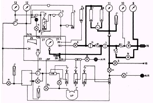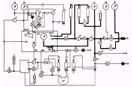 Figure 2-6.\Model 1172AS100 rotameter system. rotameter tube, it indicates a leak. If no leakage is indicated during this test, continue. Return the leakage selector valve (F) to the HIGH position and turn the leakage on/off valve (G) to the OFF position. By slightly cracking the cap at the N2 input connection, you can bleed any pressure indicated on the N2 input pressure gage (27) At this time, a line with two bayonet fittings must be attached between the low-pressure connection (19) and the 200-CCM leakage connection (20) inside the chamber. This line is used to check for any leakage through the leakage control valve (E). Leakage is indicated on the overboard rotameter (G). If no leakage is indicated, remove the side attached to the leakage connection (20) and attach it to the reference tap connection (21 ). (This sets your test stand up to perform the differential pressure system test.) The reference tap connection (21) is also located inside the chamber. Place a cap over the piezometer and turn the pressure selector valve (D) to the H2O position. Slowly open the leakage control valve (E) until the pressure/suction manometer (4) indicates 9.0 inches of water (in. H 2O). Fully closing this valve (E) may be necessary after you reach 9.0 in. H2O. No leakage should be indicated on the high-range leakage rotameter (8). Turn the leakage selector valve (F) to the LOW RANGE position. No leakage should be indicated on the low-range leakage rotameter (7). Close the leakage control valve (E) and turn the leakage selector valve (F) to the HIGH RANGE position. Now disconnect the line at the low-pressure connection (19). Bleed the pressure from the pressure/ suction manometer (4); then reconnect the lines. If you find this system has no leakage, your test stand is set up to perform the differential pressure indicating system leakage test. |