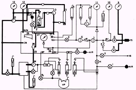 Figure 2-7.\Model 1172AS100 differential pressure indicating system. piezometer (26) by a line that runs from the reference tap connection (21) to the piezometer (26). The pressure/suction manometer (4) registers that pressure or suction. The pressure alS O registers on the HG manometer (5). NOTE: The HG manometer (5) receives pressure or suction from the piezometer regardless of the position of the pressure selector valve (D). From the pressure/suction manometer (4), the pressure flows through another line trap to a connection at the low-range altimeter (13). It then flows to the reference pressure selector valve (O). With the valve (O) in the ALTITUDE CHAMBER position, differential pressure is transmitted to the chamber reference port (N/N). Other valves and connections that affect readings on the pressure/suction manometer (4) are the helmet reference tap (24), the suit simulator reference shutoff valve (R), and the pressure equalizer valve (Z). The helmet reference tap (24) is used when you test the full pressure suit helmet. It gives the differential pressure between the respiratory section and the suit section. When you test the full pressure suit controllers, the suit simulator shutoff valve (R) is used in conjunction with the reference pressure selector valve (O) to give the actual altitudes within the suit. The pressure equalizer valve (Z) equalizes the pressure in the pressure/suction manometer (4) as does the pressure selector valve (D) when the pressure selector valve is placed in the HG position. PRESSURIZING THE DIFFERENTIAL PRESSURE INDICATING SYSTEM NOTE: At this point, knowing that 1.0 psig = 27.7 in. H2O or 2.0 in. HG will be helpful to you. To use the differential pressure indicating system, open the leakage control valve (E) until the pressure/suction manometer (4) indicates 16.0 in. H2O. Place the leakage selector valve(D) in the HG position. Now close the leakage control valve (E). The system should now be maintaining 16.0 in. H2O. If the system has a leak, the high-range flowmeter (8) or the low-range flowmeter (7) will indicate it. If the system has no leakage, disconnect the line between the low-pressure connection (19) and the reference tap connection (21); then remove the plug from the piezometer. To bleed the system, back out on the low-pressure regulator (N) and open the bleed valve (S). After you bleed the system, close the system bleed valve (S). Leave all valves and connections in their present position. Now you are ready to check the vacuum system. VACUUM SYSTEM # This system (figure 2-8) is used to evacuate the chamber to simulated altitudes. It also allows you to draw flows from any item that you have under test. The vacuum pump is considered the heart of the test stand. It is equipped with a vent that is provided to remove any corrosive vapors from the oil used in the pump. Use MIL-L-83767, Type I. Two valves work in direct conjunction with the pump: the vacuum control valve (Bl) and the output valve (C). The vacuum control valve (Bl) will directly evacuate the chamber to any simulated altitude necessary to test oxygen components. The output valve (C) draws a flow through the item under test. By using the output valve (C), you can draw a flow through the item under test, through the piezometer (26), the flow selector valve (M), the output vol-o-flo element, and into the vacuum pump. When you place the selector valve (M) in the SUIT SIMULATOR position and open the flutter dampener valve (J), the flow is identical to the flow that occurs when you use the output valve (C), except the flow is drawn through the suit simulator tank. |