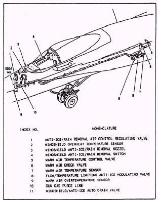 Figure 1-1.- Windshield Anti-ice and rain removal system component locator. supply temperature to below 375 25 F. The combined action of the warm air overtemperature sensor and flow/ temperature limiting anti-ice modulating valve also provides the required protection against a defective warm air temperature control valve. Anti-Ice/ Rain Removal Air Control Regulating -Valve The anti-ice/ rain removal air control regulating valve completes the final pressure regulation and flow control before airflow reaches the anti-ice/ rain removal nozzle. The valve regulates pressure and flow rate depending on the position of the windshield anti-ice/ rain removal s w i t c h. Windshield Overheat Temperature Sensor The windshield overheat temperature sensor, located downstream of the anti-ice/ rain removal air control regulating valve, is a temperature-activated switch, which opens if airflow temperature reaches 290 5 F. It closes when airflow temperature drops to 280 5 F. When the switch is open, a ground is lost to the signal data converter and the signal data computer, which causes the digital display indicator to display a (WDSHLD HOT) caution message. ANTI-G SYSTEM The anti-g system supplies and controls the flow of air pressure to the pilot's anti-g suit to compensate for forces exerted upon the human body during flight conditions. This system is designed to accomplish the following: 1. Provide protection against grayout, blackout, and unconsciousness 2. Alleviate fatigue and decreased mental alertness, which may result from repeated accelerations below the blackout level 3. Provide a method by which the pilot may relieve leg stiffness and physical tension during flight 4. Provide the pilot with a physical indication of the approximate acceleration to which the air-craft is being subjected |