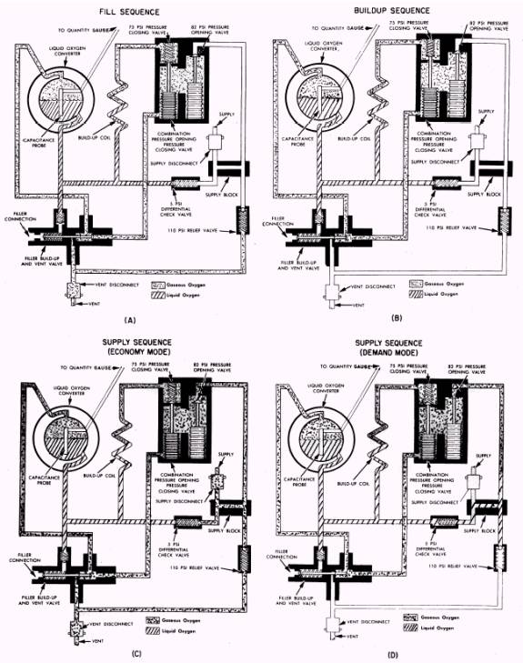 Figure 4-15.- Liquid oxygen converter operation. is installed in the converter system to relieve excessive pressure. Supply Sequence The supply sequence of the liquid oxygen system consists of two modes of operation- the economy mode, in which gaseous oxygen is fed from the converter, and the demand mode, in which oxygen flows from the converter as a liquid and vaporizes to a gas in the feed line. In the economy mode of operation (fig. 4-15, supply sequence, view C), limited demand upon the system allows the converter to supply gaseous oxygen directly as a result of drawing off the gaseous oxygen stored within the top of the converter. At approximately 82 psi, the pressure opening valve unseats and allows gaseous oxygen to flow from the converter to the supply system. Oxygen then flows from the upper (gas) portion of the converter, rather than the liquid side. When the amount of oxygen demanded by the crew exceeds the supply capabilities of the economy mode, the pressure opening valve closes. As the crew continues to draw upon the oxygen supply, the supply system pressure becomes lower than that of the converter. When a pressure differential of 5 psi occurs, the differential check valve opens (fig. 4-15, supply sequence, views C and D) and allows liquid oxygen to flow into the supply line, thus creating the demand mode. Converter pressure will build up while the system is operating in the demand mode. As the pressure again approaches 82 psi, the pressure opening valve will again unseat, switching the supply sequence back into the economy mode. The converter automatically switches itself back and forth between the economy and demand modes while supplying oxygen to the crew.