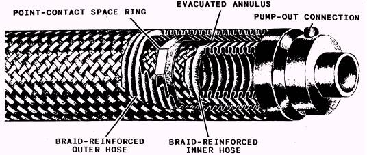TRANSFER LINES Aside from certain large fixed facility piping, most LOX systems are made up of transfer lines- often segmented (in sections) for ease of demountability (reconnecting) so one transfer system can service several pieces of equipment. Generally, what is true for insulation of tanks is applicable to other similar equipment with the exception of transfer lines. Transfer lines are cooled and warmed many times during the course of a day. The liquid oxygen waste due to cooldown losses can be significant. A high vacuum insulated transfer line generally is best for quick, frequent transfers since no insulated cooldown mass is involved. To help reduce LOX waste due to cooldown of transfer lines, several wraps of multilayer insulation adds very little mass to the system, decreases the thermal radiation, and requires less vacuum (if any) in the insulation annulus. Transfer lines are most commonly constructed of bronze, stainless steel, or aluminum. In the case of vacuum-jacketed lines, annular spaces are necessary to prevent the inner liquid-bearing lines from touching the outer jacket wall. Low thermal conductivity materials are used for this purpose, and schemes are incorporated into the spacer design to provide only a small area contact wherever possible, since the heat influx must be kept low. Although rigid lines often are used in stationary facility piping installations and for some remountable applications, the predominant type for use in the field is corrugated flexible metal transfer hose (fig. 5-2). Flexible metal hose is somewhat more vulnerable to abuse than its rigid counterpart; therefore, it usually has a braided metallic covering or tough plastic sheath over the external corrugations. The high working pressure capability of the inner line requires the application of a strengthening braid over it as well. Even though such protection provides a degree of reinforcement to the hose, it should not be subjected to overpressurization in service since a bellowslike action still may be possible if the covering is not securely fastened at the end connections. High pressure expands the hose axially, causing it to grow by lengthening the distance between each corrugation, which makes the line less flexible. A vital consideration in the construction of all transfer lines is the matter of joints between line segments. Assuming that the transfer lines are vacuum-jacketed to the general region of the joint, the concern with the joint and the closure of the vacuum-jacket in close proximity to the joint is important. The transfer line connector/ coupling (bayonet coupling) in figure 5-3 is one of the better designs available today, and the most expensive. To safely and efficiently use transfer lines, several things must be remembered. NEVER trap liquid in a line between closed valves unless you are absolutely certain that some type of relief device is functionally associated with the inner