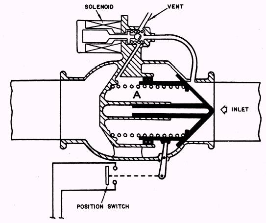 Eight cyclic valves are used in the deice system. Two cyclic valves are located in each outboard wing, one in each inboard wing, and one in each horizontal stabilizer. The cyclic valve is normally spring-loaded closed, electrically controlled, and pneumatically actuated. The cyclic valve controls the cyclic distribution of bleed air to the appropriate segment of the deice system piccolo tubes. The cyclic valve is pneumatically controlled by a bleed-air solenoid valve (fig. 1-13). When the solenoid is not energized, the spring keeps the cyclic valve closed, and inlet pressure is vented to ambient and to the closing side of the valve (chamber A). When the solenoid is energized, the inlet pressure is blocked, and when it builds to