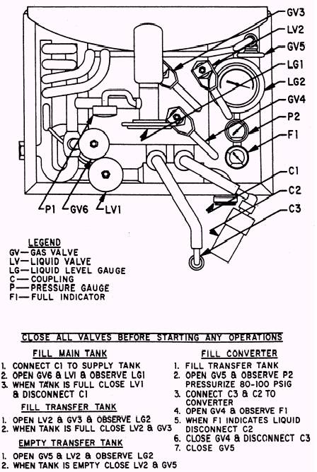 Filling.- Normally the servicing-trailer is filled from central supply tanks. These tanks have transfer hoses terminating in couplings that match the fill-drain line coupling on the trailer. Operation of the supply tank should be in accordance with the procedures in its operation manual. Filling consists of the following procedures. Ensure that all required safety equipment is in use and all safety precautions have been taken. Place