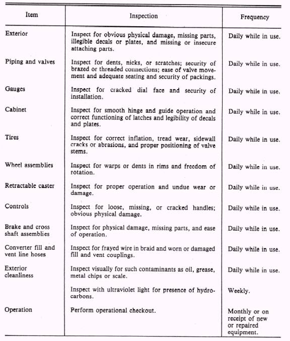Table 5-1.- Periodic Inspection the trailer on a level surface or ensure that the tank has a level attitude. Close all control valves on the storage tank. Pressurize the LOX supply tank to the required pressure for transfer to the TMU 70/ M. Remove the dust cover from the supply tank transfer line and purge hose. After purging, connect the fill-drain line coupling (1) (fig. 5-8) to the transfer hose. Open the TMU 70/ M's storage tank vent line shutoff valve (5) and fill-drain line shutoff valve (3). CAUTION Pressure should not be allowed to rise above 55 psi in the storage tank. Monitor the storage tank pressure gauge (7) closely during cooldown. Open the service valve on the supply tank slowly, and allow only a partial flow of LOX through the transfer hose and into the trailer. Considerable vaporization will take place until the transfer hose, fill-drain line, and storage tank on the trailer have cooled down. When these have sufficiently cooled and are able to handle a full flow of LOX, open the service valve on the supply tank completely. During filling, LOX flow is through the fill-drain line filter (2) and shutoff valve (3) to the storage tank. The relief valve (4) is provided to prevent excessive pressure if the fill-drain line shutoff valve and the service valve on the supply tank are closed with cold gas or liquid trapped within the supply line. The relief valve (4) is connected to the vent line for safe discharge overboard. The vent line shutoff valve (5) is opened during filling and normal storage where safe overboard discharge is provide. Storage tank conditions are monitored and indicated by the liquid level gauge (6) and pressure gauge (7). The inner shell relief valve (8) and rupture disc (9) are provided in case of excessive pressure in the storage tank. Monitor the storage tank liquid level gauge (6) during filling. When it indicates 50 gallons or LOX starts to flow out the vent manifold, close the service valve on the supply tank. Close the fill-drain line shutoff valve (3) to relieve internal pressure. CAUTION Use extreme caution when disconnecting the transfer hose. Even though the hose has been drained and the pressure relieved, some LOX will still remain. Do not direct the hose toward personnel or other equipment. Disconnect the supply tank transfer hose, immediately drain the LOX that remains, and replace the coupling cap loosely. Tighten the cap after ensuring that all LOX has vaporized and bled off. Close all control valves on the service trailer except the storage tank vent valve (5). NOTE: Observe the time required to fill the TMU-70/ M. Filling will vary with each supply tank and supply line system. Under normal con-ditions and 30 psi transfer pressure, the storage tank should be filled within a period of 5 to 10 minutes. Abnormal deviation from the average filling time should be cause for investigation.