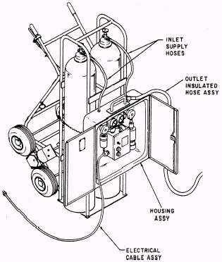 Figure 5-11.- Purging unit ready for use. the converter and pass hot nitrogen 250 F (122 C) through the converter at 50 psi for at least 2 hours. The gas exiting the converter should exceed 100 F (38 C), or be in accordance with purging equip-ment instructions. Next, service the converter and install it in the aircraft. Use an oxygen mask to smell for odors. If odors persist, drain and purge the converter again. Aircraft systems are purged in the same manner as a LOX converter. If an adapter is not supplied with the purging unit, use a supply fitting from a LOX converter. Different types of purging equipment is used to purge oxygen containers and systems. Only one type unit, the Aircraft Liquid Oxygen System Gas Purging Set, manufactured by Avel Corporation, will be discussed here.