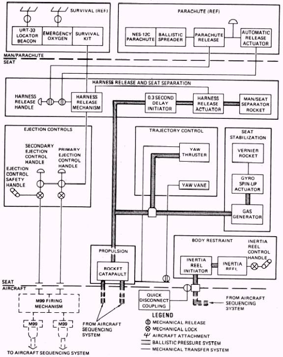 Figure 6-1.- Ejection seat system sequencing schematic. aircraft-attached 0.3-second delay initiator, which fires the rocket catapult. On the for: ward two seats, an additional 0.5-second delay MK 11 MOD 0 initiator is in series with the 0.3-second delay initiator to delay forward seat ejection sequencing by 0.5 second after the rear seats eject. The eject mode selector handles on the pilot's and copilot's seat provide pilot or copilot control of individual or group ejection of crew members. The first-phase propulsion of the rocket catapult starts the seat up in the guide rails. When the seat has moved approximately two-thirds the length of the guide rails, the second (or sustainer) phase of the rocket catapult ignites to provide boost for the additional height required during ejection. At sustainer separation, gas pressure from rocket ignition is used to ignite the seat stabilization control system, the yaw thruster, and the seat-attached 0.3-second delay ini-tiator for harness release. Before the seat clears the guide rails, the following five functions occur: crew member services to the aircraft is disconnected; the parachute arming lanyard is pulled, which arms the parachute release actuator; the lanyard con-nected to the aircraft structure actuates the emergency oxygen bottle in the survival kit to supply the crew member with emergency bailout oxygen; the yaw vane is deployed, and the quick-disconnect coupling on the right side of the seat separates. Following burnout of the yaw thruster rocket and sustainer rocket, and upon the completion of the pitch stabilization control function, the seat-attached 0.3-second delay initiator fires. Gas pressure from the initi-ator enters the harness release actuator, which drives the piston upward to rotate the bell crank mounted below the actuator to retract two survival kit retaining pins and shoulder harness pin from two inertia reel straps. Retraction of retaining pins frees the crew member and his survival equipment from the seat. The base of the clevis on the lower end of the actuator piston strikes the firing control disconnect actuating arm. Movement of the arm retracts a spring-loaded retaining pin from the firing control dis-connect assembly, and releases the ejection control handle cables from the assembly. A crew member, who may still be holding one of the ejection control handles, is now freed from any restraints that would prevent the final separation from the seat. As the harness release actuator piston completes the stroke, the pressure within the actuator is ported to the man/ seat separator rocket, causing the rocket to ignite. The thrust of the man/ seat separator rocket simultaneously rotates and propels the seat away from the crew member with a differential velocity of up to 25 to 30 feet per second. The probability of collison between the seat and a crew member or the parachute after separation is minimized, be-cause no attempt is made to decelerate the seat as the seat travels along a divergent trajectory. As the seat and crew member move into divergent paths, the parachute actuator is armed and the external pilot chute is deployed. After a 0.55-second de-lay, the main parachute is aerodynamically deployed. Just before the parachute shroud lines stretch, the ballistic spreading gun is fired to forcefully initiate parachute infla-tion. If a crew member is above an altitude of 14,000 ( 500) feet, a preset aneroid in the parachute actuator delays parachute de-ployment until the crew member has de-scended to the correct altitude. The para-chute actuator delay cartridge then fires, causing parachute deployment. The crew mem-ber can select parachute deployment at any altitude by pulling the manual ripcord on the parachute. If the automatic ejection system malfunc-tions, the crew member can pull the inter-nal jettison handle/ initiator( s) in the crew compartment to cut the window/ hatches away. Over-the-side bailout is initiated by pulling the harness release mechanism, which discon-nects the rigid survival kit and the para-chute from the seat structure. The crew member can then stand up and exit the crew compartment. When clear of the air-craft, the crew member pulls the parachute manual ripcord located on the left riser strap immediately above the parachute can-opy release fitting. The parachute flaps are thereby released, and the parachute deploys. COMPONENTS Figure 6-2 shows the front and rear views of the ESCAPAC 1E-1 ejection seat assembly and its various components. Ejection Seat The ejection seat is the basic structure that supports the equipment and mechanisms necessary for crew member comfort and safety while in flight or during the ejection sequence. The seat and associated components are constructed almost entirely of aluminum. The seat is equipped with fixed window/ hatch breakers at each top forward corner to permit seat ejection through a 1/ 4-inch stretched acrylic window or hatch. At the upper center of the seat are headrest cushions that provide cushioning for the safety and comfort of the crew member. On each side of the seat are three seat rollers, which allow for vertical height adjustment during normal condi-tions and upward travel during ejection. Extended seat bucket sides protect the crew member's knees and legs from flailing during seat ejection. The seat structure supports the parachute assembly and survival kit.