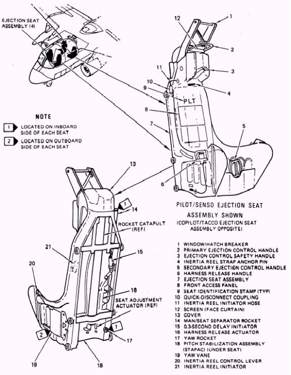 Figure 6-2.- Ejection seat assembly. rocket around the pitch axis, which changes the thrust/cg relationship and applies a correcting moment. YAW THRUSTER.- To achieve safe separation of multicrew seat trajectories, a yaw thruster is used on each seat to provide a controlled, lateral-angle dispersion from the aircraft's direction of flight. Two types of yaw thrusters are used on the forward and aft seats, with location always on the inboard side of each seat. A low yaw thruster, producing approximately a 10.4 pound-second impulse for 0.1 second, is installed on each forward seat, and a high yaw thruster, producing approximately a 21.0 pound-second impulse for 0.1 second, is installed on each aft seat. The yaw thruster is ignited by high-pressure gas ported from the top of the rocket catapult. To provide proper yaw rotational impulse for each seat installation, the yaw thruster is mounted to provide a predetermined moment arm about the center of gravity of the seat/crew member system. The mounting bracket for each thruster incorporates a boss that, when combined with a fixed stop permanently mounted on each guide rail, will prevent incorrect installation. The right and left seats are yawed to produce changes in the trajectory paths. Each of the four crew member seats will be separated from the others at parachute full-open condition under nominal lateral center-of-gravity conditions. YAW VANE.- To assist in providing the proper yaw rotation at higher airspeeds, an aerodynamic yaw vane is installed on the out-board, lower aft side of each seat. The yaw vane deploys just as the seat leaves the guide rails and presents a drag area of 1/2 square foot to yaw the seat approximately 20 degrees. At this position, the vane is blanked by the man/seat structure, and becomes ineffective in creating any further increase in the degree of rotation.