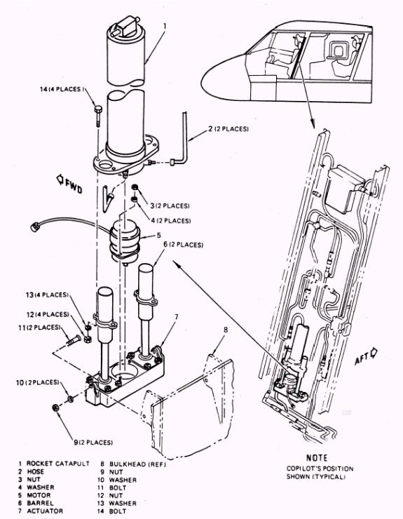 Aircraft-Attached Ejection Seat Components The following ejection seat related com-ponents are located on the aircraft structure and remain in the aircraft when the seat is removed for maintenance. GUIDE RAILS.- Two guide rails are located on each canted bulkhead behind each crew member. Each set of guide rails is machined from aluminum extrusions. Each outboard rail has a machined cam at the top to release the aero-dynamic yaw vane as the seat travels up the guide rails. Two holes in each inboard guide rail allow installation of two seat servicing pins to support each seat at the 42-inch alternate maintenance position. SEAT CONTROL SYSTEM.- The seat con-trol system permits vertical height adjustment of