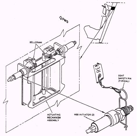 ROCKET CATAPULT.- The rocket catapult provides the necessary propulsion to eject the seat and crew member from the aircraft during the ejection sequence. The performance capability of the rocket catapult at zero altitude and zero airspeed reduces the effects of high sink rate and nosedown attitudes encountered during critical approach and landing operations. The rocket catapult is secured at the top center of the seat back, and is supported at the base by twin barrels of the seat adjustment actuator. Two attachments on the actuator secure the actuator to the aircraft bulkhead. M99 INITIATORS.- Two M99 initiators are installed on the M99 initiator actuating mechanism (fig. 6-5) near the top of each canted bulkhead behind the pilot's and copilot's seats, and one M99 initiator is installed at each tactical air coordinator (TACCO) and sensor operator (SENSO) seat location. The M99 initiator is a mechanically fired, pressure-developing source. Each M99 initiator, consisting of a constant-volume cylinder with a tube connection at one end, contains a mechanically fired mechanism and cartridge. The M99 initiator firing mechanism can be secured in a safe position by a safety pin that passes through the cap and a groove on the side of the M99 initiator pin. Pulling either the primary or secondary ejection control handle initiates the ejection sequence, which, in turn, rotates the firing control disconnect, moves two firing rods