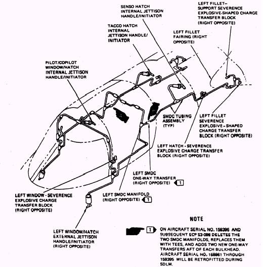 ALTITUDE SENSOR SWITCH.- An altitude sensor switch is located on the forward bulkhead of the camera compartment. The sensor switch monitors the aircraft altitude. When the eject mode selector valve handle is in the up or SELF-EJECT position and the aircraft altitude is less than 15,000 feet, the sensor switch causes the seat select indicator on the annunciator panel (located on the center instrument panel) to come on. When the aircraft altitude reaches or exceeds 15,000 feet, the seat select indicator goes off. GROUP EJECT INDICATORS.- A group eject indicator is installed on the SENSO and TACCO instrument panels. When the pilot's or copilot's selector valve handle is in the down or GROUP EJECT position, a switch in the selector valve completes an electrical ground, and causes both group eject indicators to come on. When both selector valve handles are in the up or SELF EJECT position, the group eject indicators go off. EJECTION WARNING SYSTEM.- The ejection warning system is used to warn the TACCO and SENSO that an emergency is occurring, and that seat ejection is about to be initiated. The system uses an eject switch on the eyebrow panel, an emergency power unit, a flasher, and eject indicators on the TACCO and SENSO instrument panels. The pilot or copilot sets the eject switch to EJECT, which turns on flashing eject indicators on the TACCO and SENSO instrument panels.