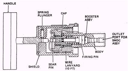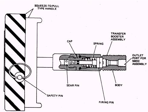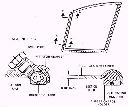 sequence is from the handle/ initiator (any one) to the SMDC, to the explosive charge, which is the actual cutting tool for the window or hatch glass. If either or both the TACCO and SENSO hatches are to be blown, the respective fillet and fillet support will be cut to allow complete egress of the hatch. When either the TACCO or SENSO crew member actuates the handle/