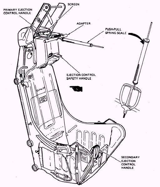 Attach push-pull spring scale to the secondary ejection control handle and pull upward on the scale. A force of 25 2 pounds is required to unseat the handle from the stowed detent position.