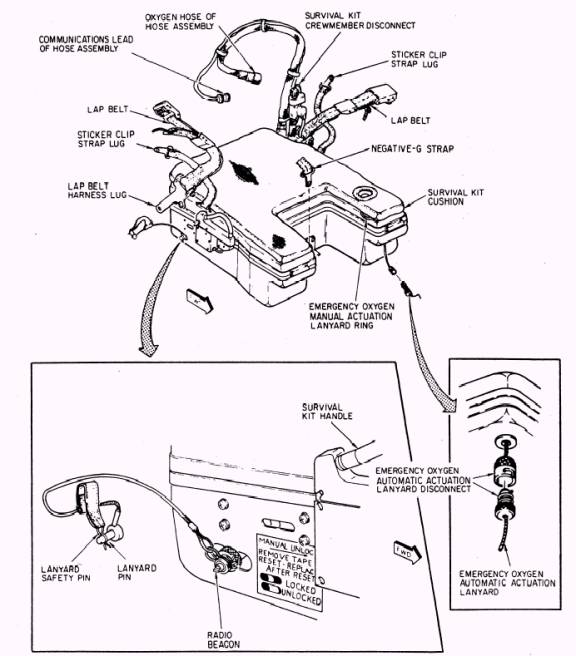 Figure 6-24.- SKU-3/ A survival kit on the forward lower half of the survival kit. The emergency oxygen system, located in the lid of the survival kit, consists of an emergency oxygen cylinder, reducer assembly, actuation assembly, and manifold assembly. A lanyard and quick-disconnect fitting provide automatic actuation of the emergency oxygen system during ejection. If the aircraft oxygen system fails, emergency oxygen is available by actuating the emergency oxygen manual release. The release is a green ring located on the forward left side of the survival kit. A mounting is provided for the radio locator beacon and lanyard. The lanyard actuates the beacon upon ejection. LEG RESTRAINTS.- Two leg restraint line snubbing units and lines are mounted to the for-ward structure of the seat bucket. The leg restraint lines are secured in locks located on the inboard sides of the seat bucket. The leg restraints secure the pilot's legs to the seat during ejection. They consist of two adjustable leg garters, a restraint line, and a snubber unit for each leg. One garter is worn on the thigh and one on the lower leg. The restraint lines are routed through the garter rings and the snubber unit. One end of each restraint line is secured to the cockpit floor and the other is secured to the seat by a releasable pin. During ejection, the slack in each line is taken up and the leg lines separate at the tension rings. When the pilot and seat separate, the pins are normally released by the time-release mechanism. They may also be released by pulling the manual override handle. Both the lower garter and thigh garter contain a quick-release buckle. The leg restraint line runs through a ring that is disconnected by the buckle. This permits the pilot to exit the air-craft while wearing both the upper and lower garters. The lower restraint mechanism locks are located in the lower aft portion of the seat bucket. These locks are connected by a cross shaft and linkage to the leg restraint line locks and the negative-g strap lock. The operation of SJU-5/ A system components and subsystems is discussed in the following paragraphs.