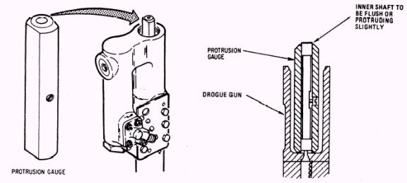 Figure 6-26.- Drogue gun firing pin protrusion check-out this check-out. You should ensure the TRM is disarmed before performing maintenance on it. Then, remove the firing body from the time-delay g-sensing release mechanism. Re-move the lockwire from the firing link and remove the hex head plug and washer from the base of the unit. Inspect the TRM for damage and/ or corrosion. If damaged or corroded, check the MIM for corrective action to be taken. Time Delay Check-Out To complete the time delay check-out, you should perform the following steps in sequence. 1. Remove the light interrupter from the test set and screw it into the base of the time-delay g-sensing release mechanism, as shown in figure 6-27. Install the TRM adapter on the time-delay test set base. Connect the adapter