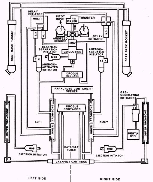 SYSTEM OPERATION The ejection sequence is initiated by pulling upward on the ejection control handle, which is located on the front panel of the seat bucket. Pulling the ejection control handle requires a force of 15 to 25 pounds through a distance of less than 4 inches. Pulling the control handle fires two M99 ejection initiators, which release hot, high-pressure gas to the ballistic signal transmission system (BSTS). Figure 6-32 is a schematic of the BSTS. The right M99 ejection initiator supplies gas pressure to the right side of the catapult cartridge igniter and the inertia reel gas-generating initiator. The left M99 ejection initiator supplies gas pressure to the left side of the catapult cartridge igniter, thereby
