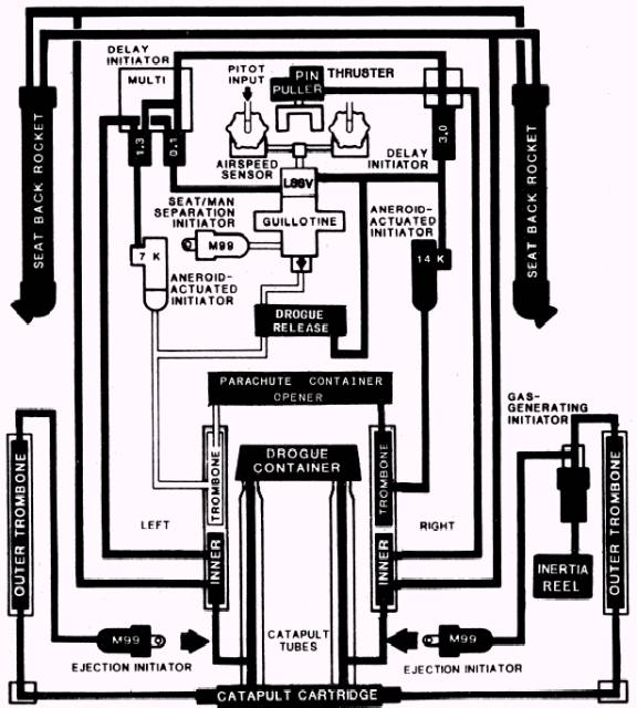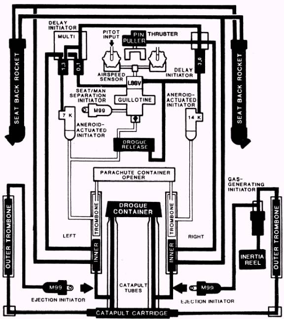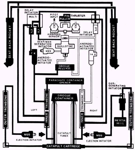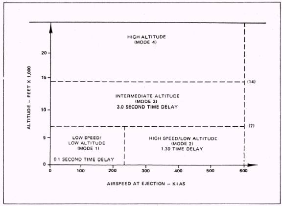 Ejection Mode Sequences The Stencel seat is equipped with a mode sequencing system that controls four automatic ejection modes. The system includes a parachute container opener that is activated by gas pressure from the 7,000-or 14,000-foot aneroid initiators, or the seat and man separation initiator. The WORD rocket is also part of the system. The WORD rocket, mounted on the back of the seat, is connected to the drogue bridle assembly on one end and to the parachute WORD bridle on the other end. The WORD rocket motor is released from the seat and fired by a lanyard as it falls away from the seat during low-speed ejections or by the pull of the drogue during high-speed ejections. The ejection sequence follows one of four modes, depending on aircraft airspeed and altitude. Mode 1 includes ejections where the air-craft is operating below 7,000 feet and at a speed less than 225 knots. Mode 2 includes an altitude below 7,000 feet, but at a speed greater than 225 knots. Mode 3 occurs above 7,000 feet, but below 14,000 feet, at any airspeed. Mode 4 occurs above 14,000 feet at any airspeed. Figure 6-33 presents a comparison of the various modes. MODE I.- Mode 1 (fig. 6- 34) is for a low-speed, low-altitude ejection. After the catapult outer tube assemblies have traveled upward a distance of approximately 31 inches, ballistic gases are ported through the inner trombone assemblies to actuate the 0.1-and 1.3-second time delays in the multiple delay initiator and the 3-second delay initiator. Gases from the 0.1-second delay actuate the drogue and WORD release and arm the 14,000-foot aneroid initiator. Below 14,000 feet, the initiator immediately actuates and gases pass through the right trombone to actuate the parachute container opener. Upon actuation of the WORD motor and drogue release assembly, the aerodynamic drag of the drogue parachute