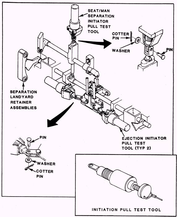 Figure 6-44.- Initiation pull-test tools installation. 10. Lower the emergency release handle to the control to the full UP position. Then, you remove DOWN and LOCKED position. When you pull the initiation pull-test tool set. up on the ejection control handle, you can observe that the initiation rotors move and the pull-test tool extends to the relaxed position. 11. Stow the ejection control and reset the