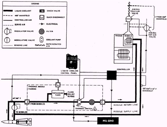SYSTEM OPERATION Setting the liquid cooling switch to the AWG-9/ AIM-54 position starts the missile coolant pump motor. The pump circulates 18 gallons of coolant per minute through the missile air-moisture-contaminant remover, heat exchanger, weapon rails, left and right pylons, launchers, and as many as six Phoenix missiles. The heat absorbed by the coolant from the missiles is removed in the air-to-coolant heat exchanger. When the loop is operating in the cooling mode, the missile inlet coolant temperature sensor controls the fluid temperature at 70 3 F by opening or closing the cold air modulating valve. The valve varies the amount of cold air flowing from the refrigeration system through the missile heat exchanger. When the temperature of the coolant fluid returning from the missile is below 40 3 F, as sensed by the missile outlet coolant temperature sensor, the cooling system automatically switches to the warm-up mode. In this mode, the cold air modulating valve closes and the hot air