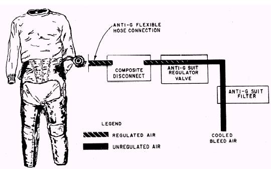 Figure 1-2.- Anti-g system. and maintains a maximum of 9 to 11 psi in the valve outlet chamber. Figure 1-4 illustrates the operation of the single-stage anti-g valve. When a force of approximately 1.5 g's is exerted on the aircraft, the activating weight over-comes the upper spring tension and closes the exhaust valve (fig. 1-4, view A). As the weight travels downward, it further depresses the valve assembly, forcing the demand valve from its seat, thus overriding the pressure of the lower spring and opening the demand valve. Air pressure then flows past the open demand valve, through the valve outlet into the valve outlet line, through the suit quick disconnect, and into the anti-g suit. As the g forces being applied to the aircraft are stabilized and become constant, the pressure under the activating weight diaphragm builds up sufficiently to lift the weight and to reduce the pressure on the valve assembly enough to close the demand valve (fig. 1-4, view B). The demand valve closes under pressure of the heavier lower spring, while the exhaust valve remains closed by the activating weight. The suit pressure is then trapped in the pressure outlet chamber of the