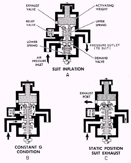 Figure 1-4.- Anti-g valve operation (single stage). anti-g valve and remains constant until the g forces change. As the g forces decrease, the downward force on the activating weight diminishes to a point at which the upper spring lifts the weight off the exhaust valve. The pressure in the suit is then vented through the exhaust port (fig. 1-4, view C) into the cockpit.