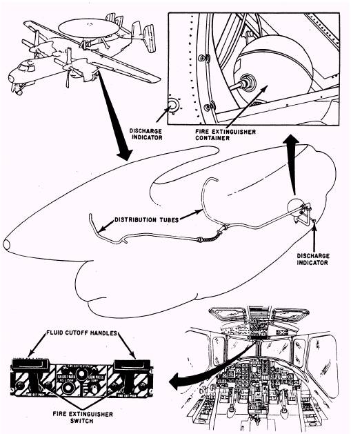 SYSTEM OPERATION/ COMPONENTS To activate the E-2 aircraft CF3Br fire extinguishing system shown in figure 1-23, pull the fluid cutoff handle for the affected engine. This action turns off combustible fluids, feathers the propeller, and shuts down the engine. Pulling this handle exposes the fire extinguisher switch. Pressing the fire extinguisher switch completes the electrical circuit necessary to detonate the explosive change in the bonnet assembly of the container (fig. 1-24). This explosion ruptures the frangible disc in the container and allows CF3Br to flow into the