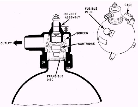 Container Assembly Each container assembly (fig. 1-24) consists of the following components: A fusible plug, pressure gage, frangible disc, cartridge, bonnet, and the container itself. The container is a spherical assembly, designed to contain 6.5 pounds of CF3Br and a precharge of 600 psi of nitrogen at (70 F). NOTE: The capacity and precharge of the container assembly will vary with the type of installation.