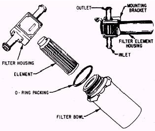 Figure 1-5.- Anti-g system filter. flexible hose to the outlet port of the anti-g pressure regulating valve. This disconnect may be l pulled up to a bumper stop to aid in connecting the anti-g suit hose. A spring-loaded cover on the disconnect prevents the entry of foreign material when the system is not in use. Anti-g System Maintenance Maintenance of the anti-g system consists mainly of removal and installation of valves and lines and servicing the filter. Component repair of the anti-g valve is limited because of the equip-ment necessary to test the valve. Component repair of the dual range anti-g valve is not recommended. The single-stage anti-g valve may be repaired at intermediate maintenance activities that have the necessary test equipment. SERVICING.- Replace the anti-g filter element at periodic intervals, or when the element becomes clogged or dirty. The replacement interval is specified in the applicable maintenance requirement cards. If the filter is removed from the aircraft, ensure the filter is reinstalled properly. The inlet and outlet ports are identified as IN and OUT to facilitate installation for proper direction of airflow. After replacing the filter element, make a thorough check to ensure that no air leaks exist. OPERATIONAL CHECK.- Perform an operational check of the anti-g system with the aircraft engine running by pressing the test button on top of the valve to determine if there is proper airflow from the system. When the test button is depressed, the amount of airflow from the disconnect should be proportional to the amount the button is depressed. Greater airflow with increased button depression indicates that the anti-g valve is operating properly on aircraft with dual range anti-g valves. This test should be performed in both the high (HI) and low (LO) ranges.