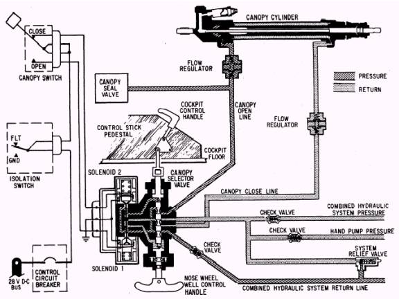 SLIDING CANOPY SYSTEM Learning Objective: Recognize the opera-tion, emergency jettison procedures, and components of the sliding canopy system. An example of the sliding canopy system is found on the A-6 aircraft. The A-6 cockpit is covered by a sliding canopy powered by a canopy system consisting of the components required for normal operation and emergency jettison of the canopy. The entire system is hydraulically operated with the exception of the jettison device. The A-6 uses a pneumatic jettison concept. Hydraulic power for operation of the system is furnished by the combined (both engines) hydraulic system or the hand pump system (fig. 2-6). SYSTEM OPERATION Hydraulic flow to open or close the canopy is controlled through a canopy selector valve, which is in the nosewheel well under the cockpit
